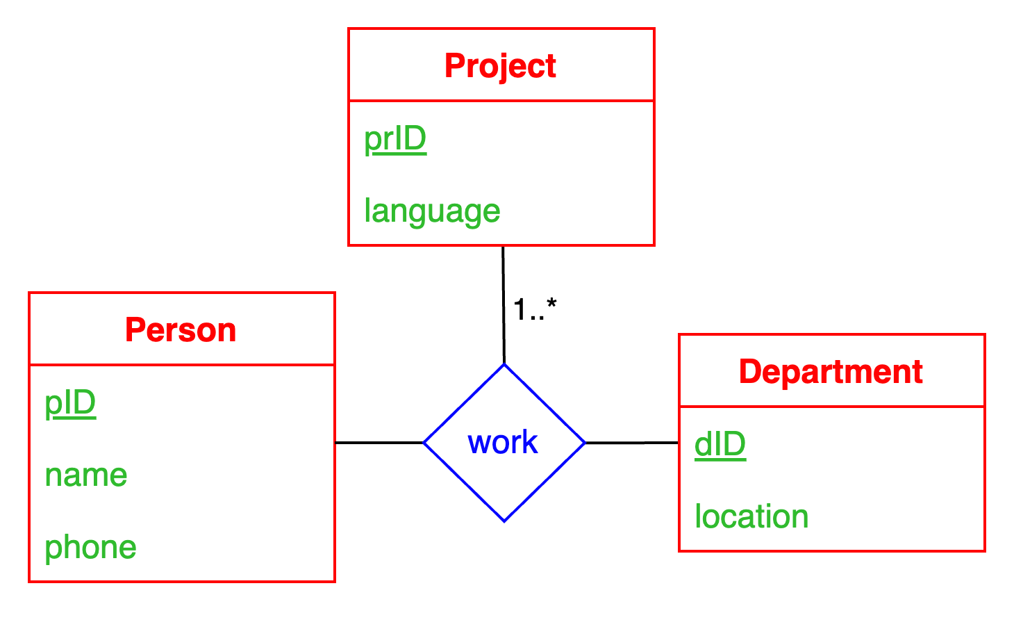 - (UML or Chen’s ER): For each (person, department) tuple, there can be many projects