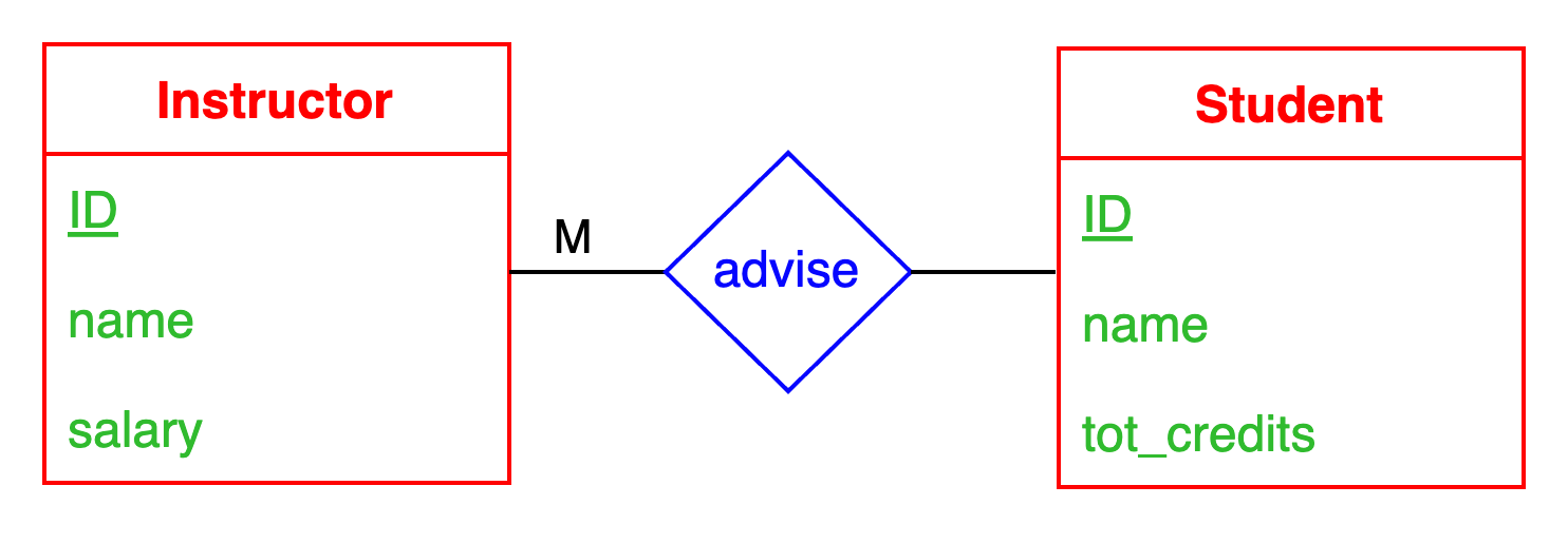 Let’s assume we have two entity sets, Instructor and Student, and a relationship set advise. Suppose they form the following design, in which M indicates 1..* (many & total participation), and 1 indicates 1..1 (one & total participation).
